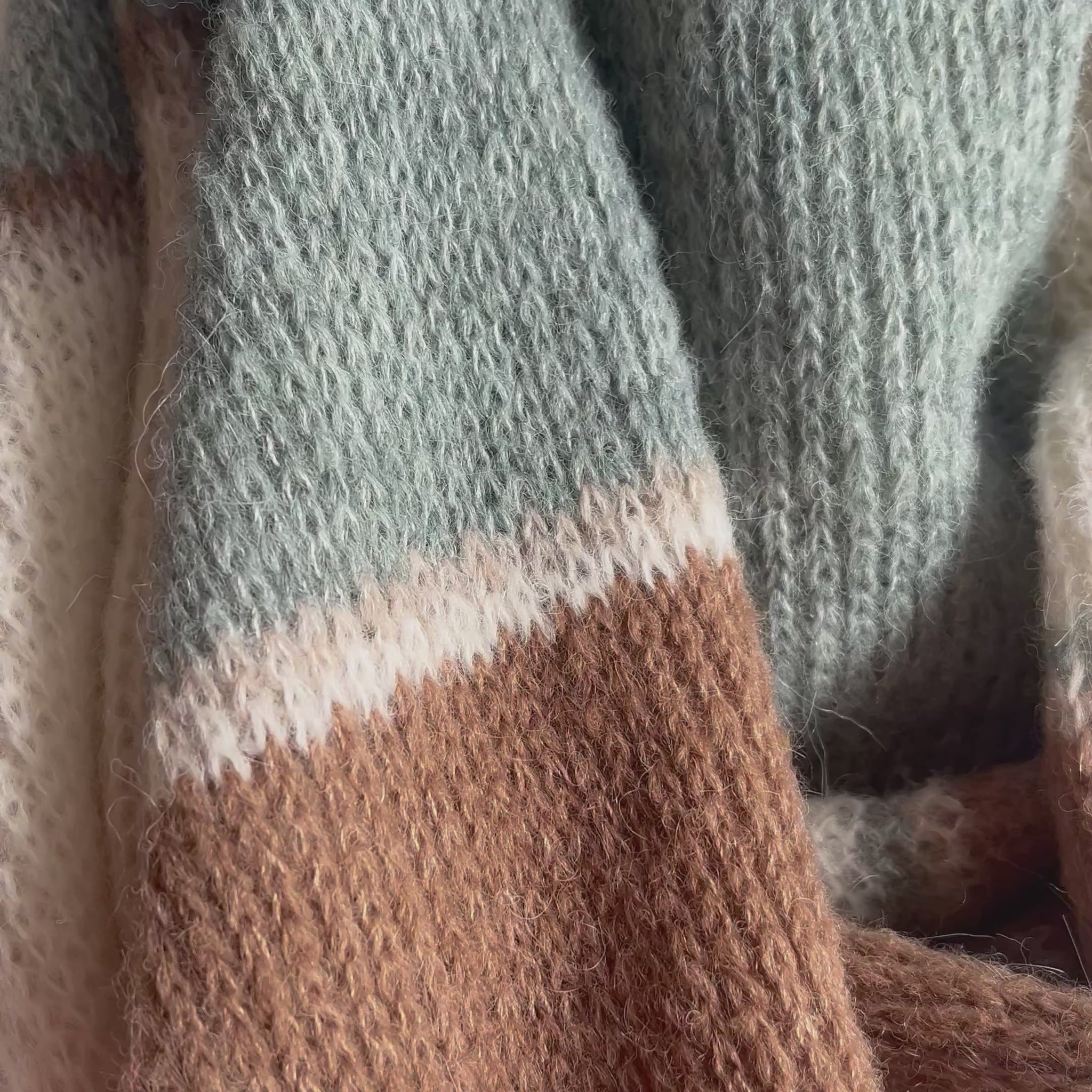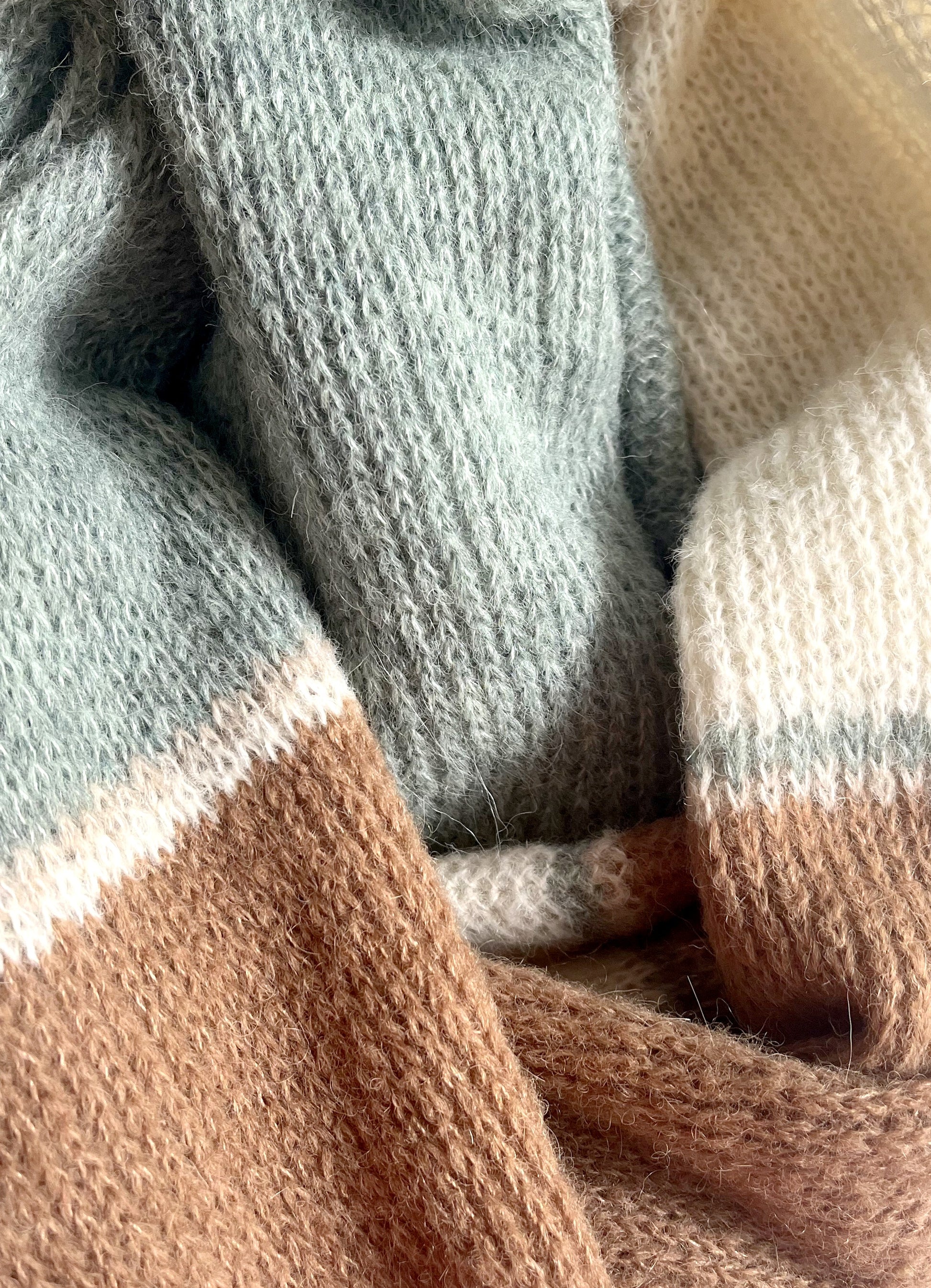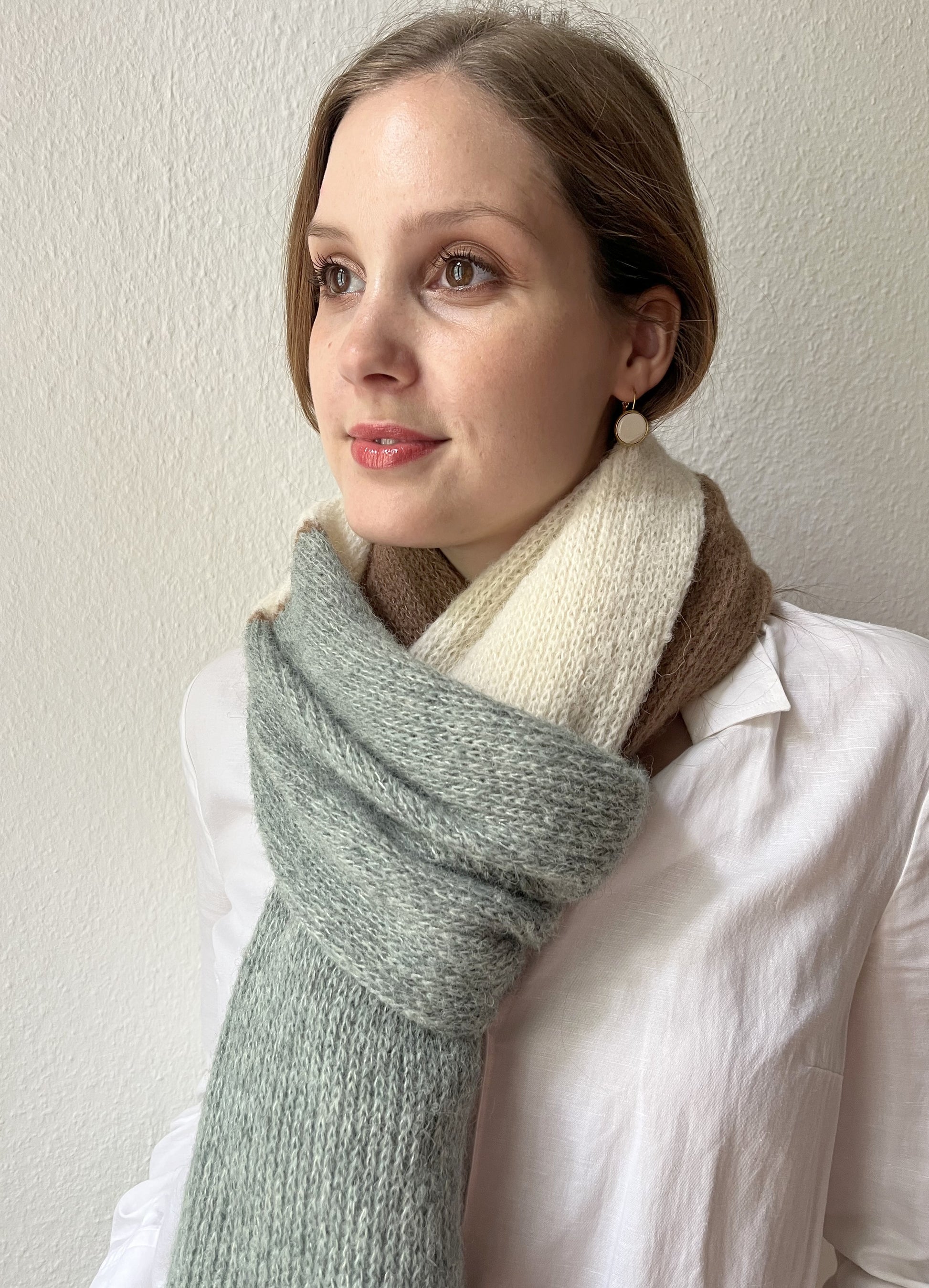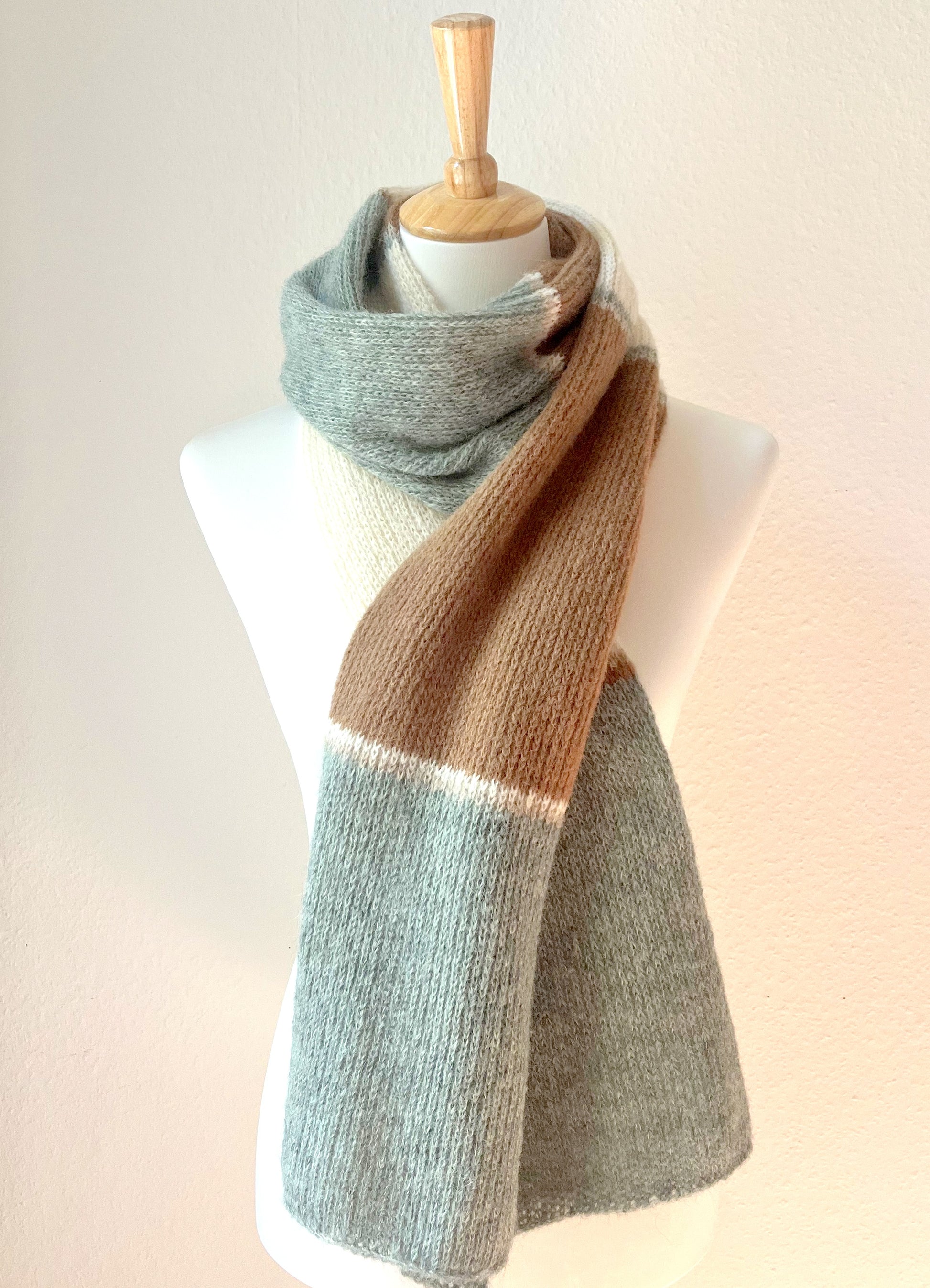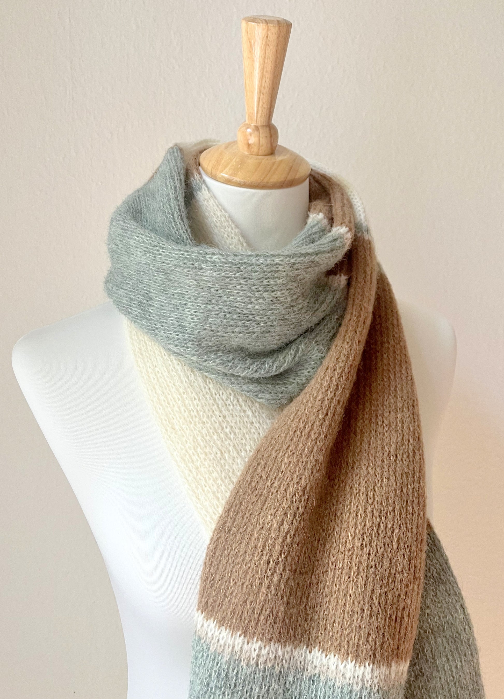 Dieser handgefertigte gestreifte Alpaka Schal in salbeigrün, cremeweiß & braun vereint hochwertige Naturmaterialien mit zeitlosem Design. Gefertigt in unserem Atelier mit der Strickmaschine und sorgfältig von Hand verarbeitet, entsteht ein besonders gleichmäßiges und langlebiges Strickbild.