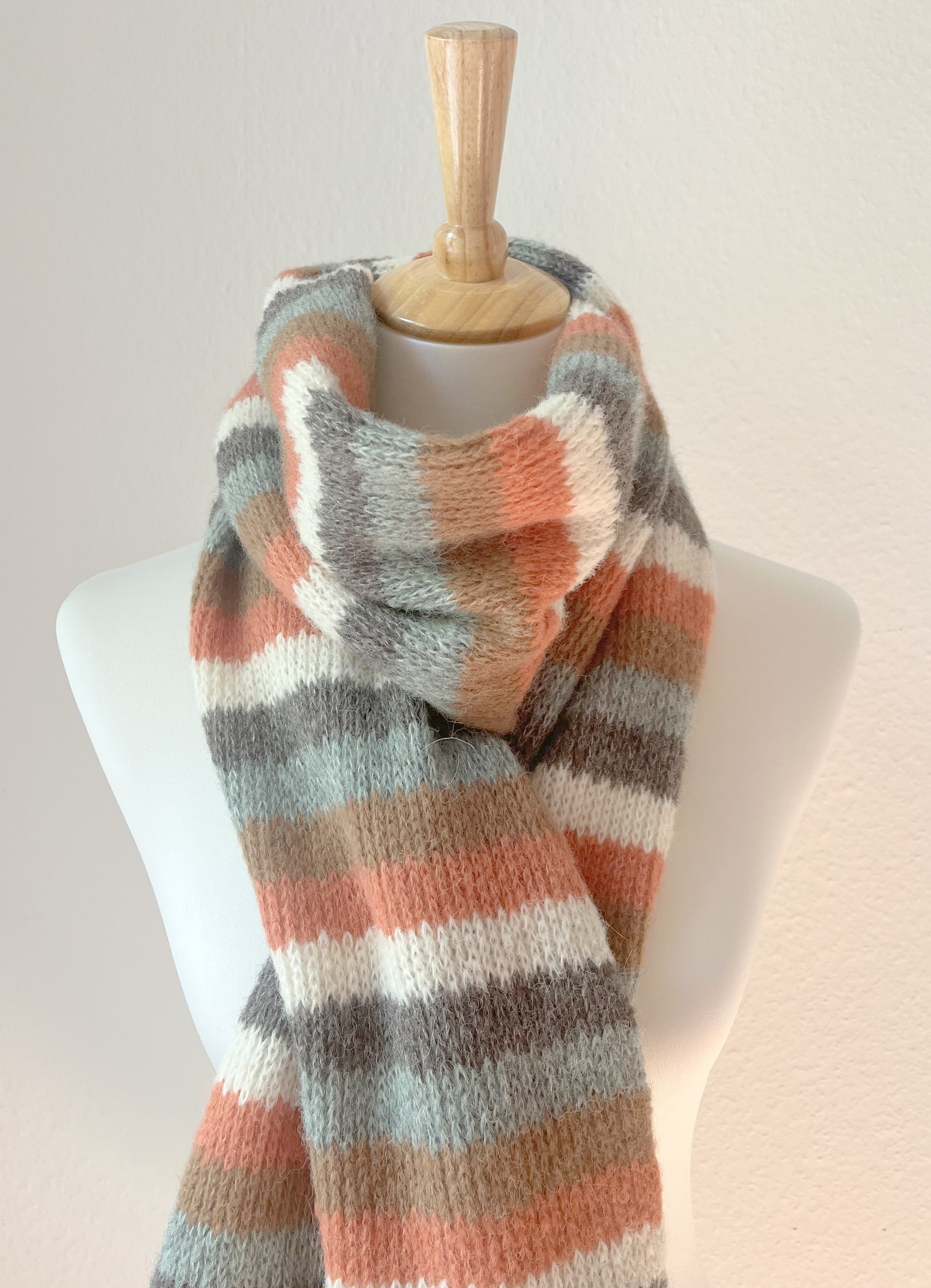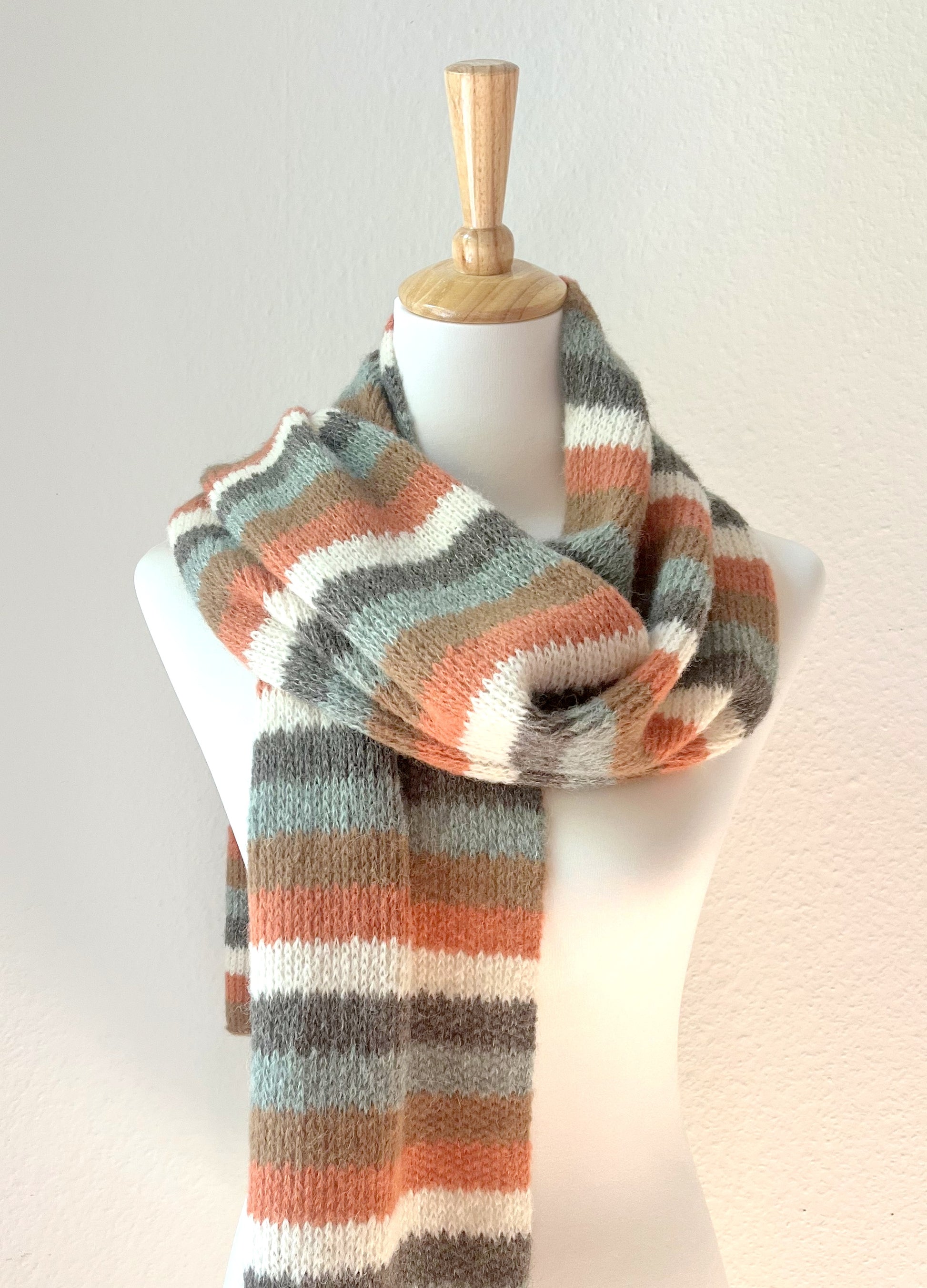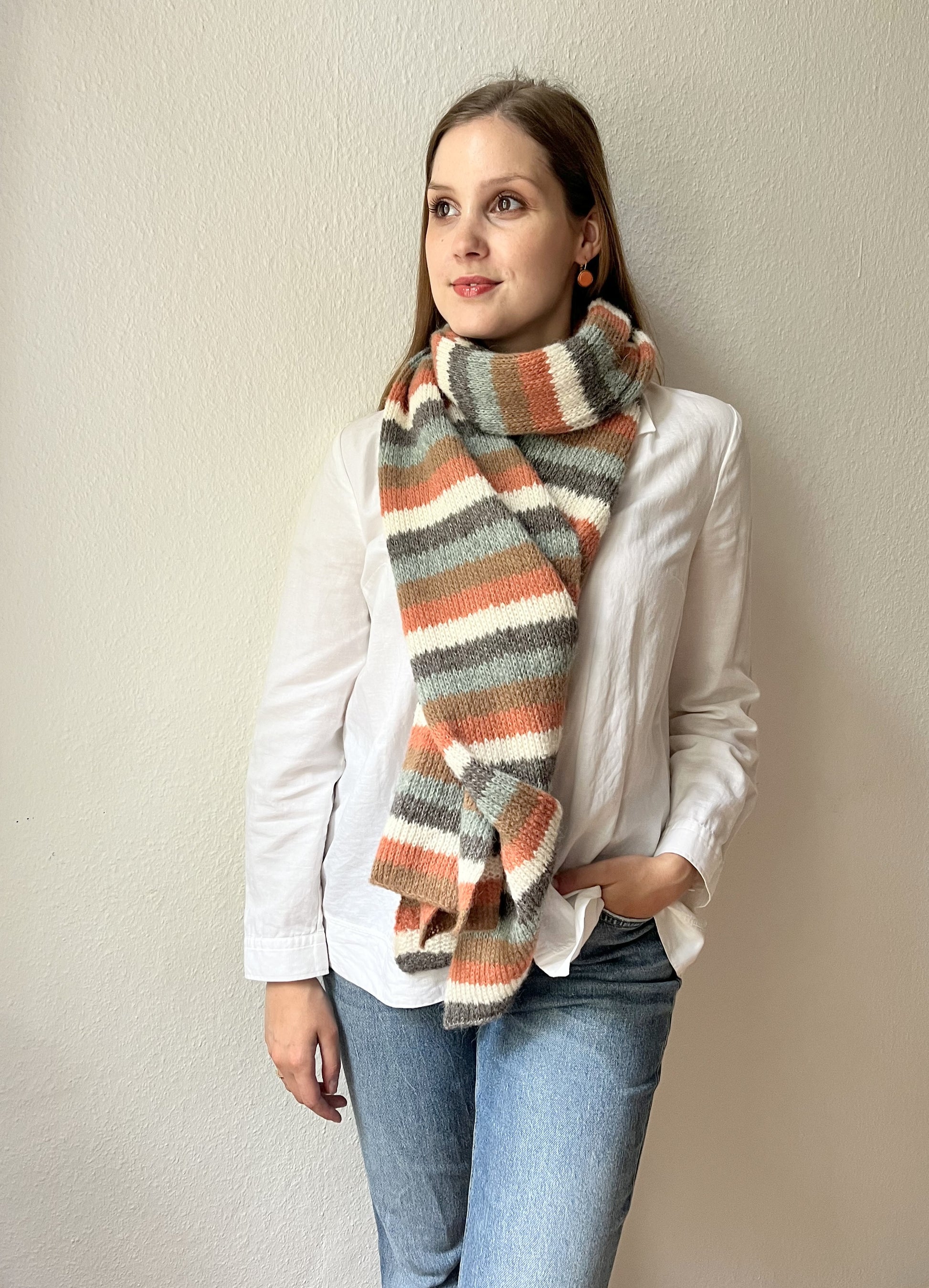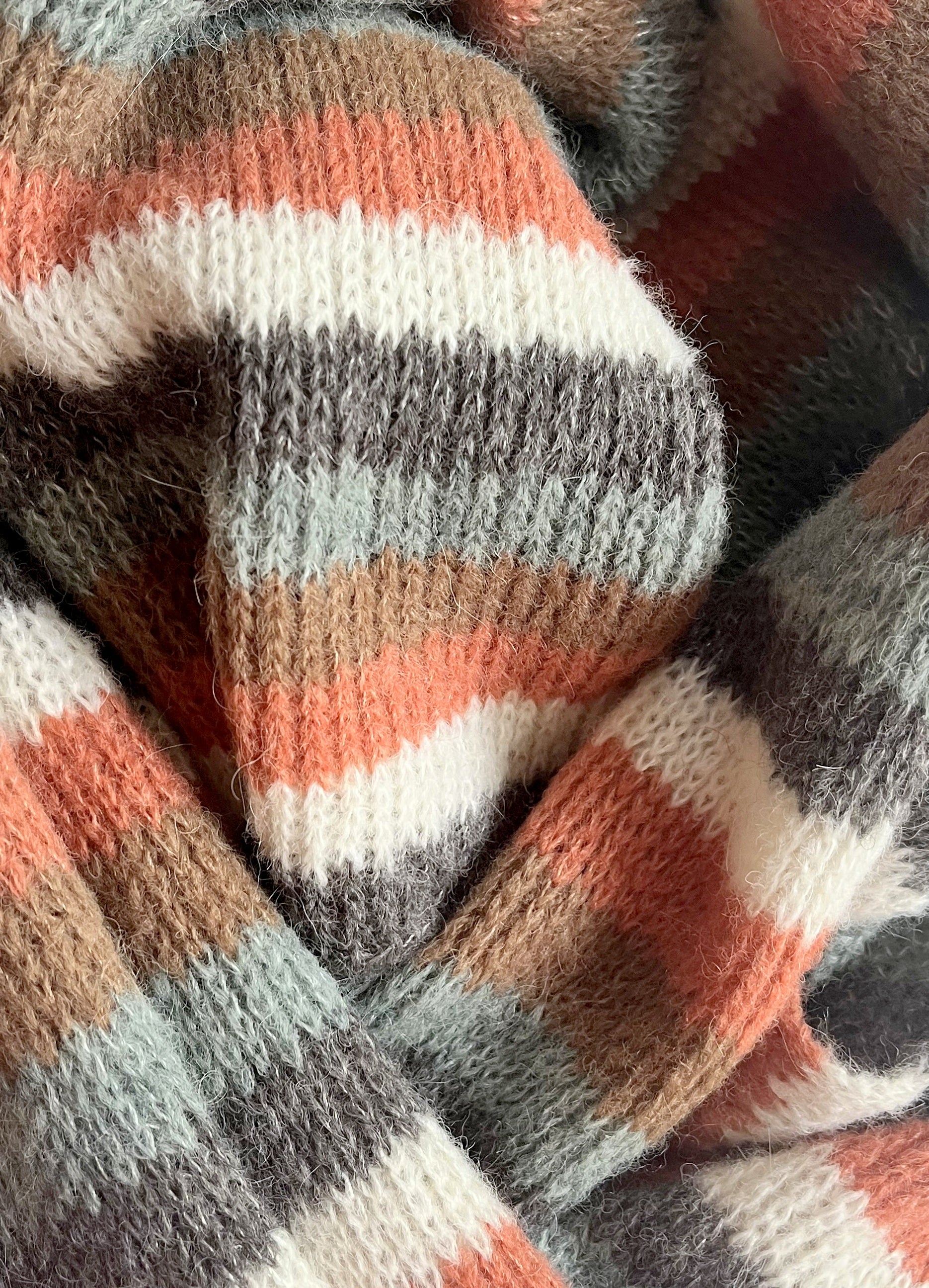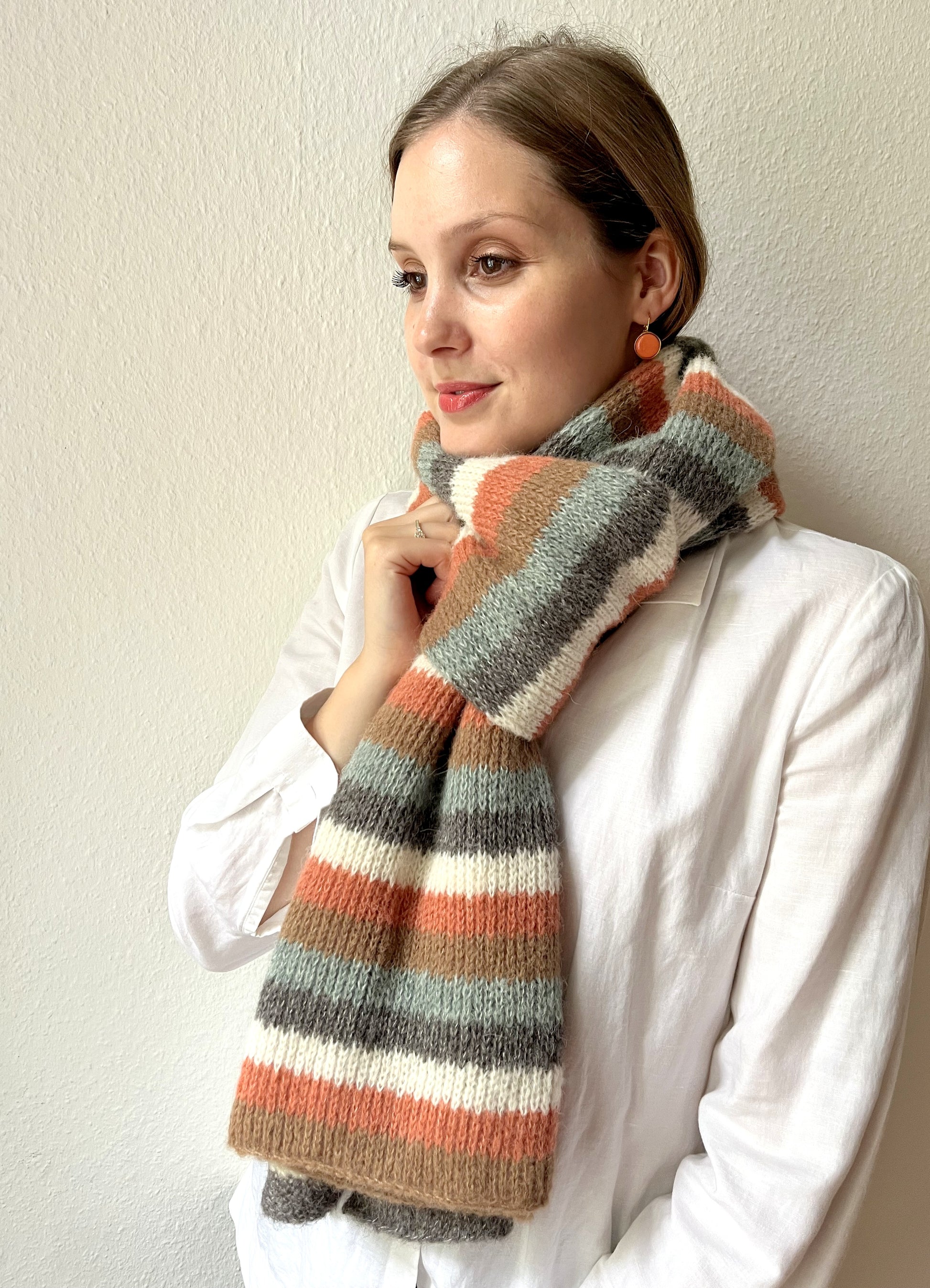 Dieser handgefertigte gestreifte Alpaka Schal in salbeigrün, braun, cremeweiß vereint hochwertige Naturmaterialien mit zeitlosem Design. Gefertigt in unserem Atelier mit der Strickmaschine und sorgfältig von Hand verarbeitet, entsteht ein besonders gleichmäßiges und langlebiges Strickbild.